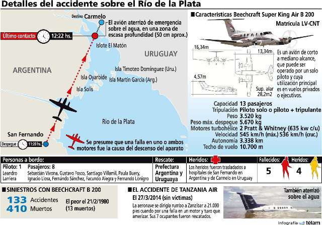 El accidente ocurrió cerca de las 14 cuando una avioneta Beech Super King Air B200 que trasladaba a ocho pasajeros y al piloto, y que había partido desde el Aeropuerto de San Fernando rumbo a la localidad de Carmelo, cayó por causas aún no determinadas a cinco millas de la costa uruguaya.