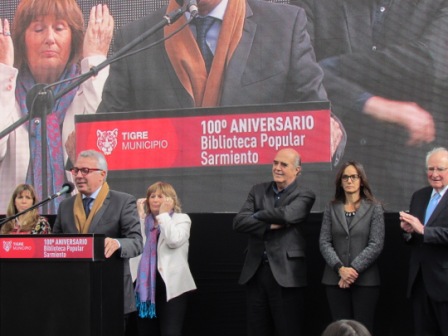 El Municipio de Tigre conmemoró el centenario de la Biblioteca Popular Sarmiento con un emotivo acto en el que estuvo presente el intendente Julio Zamora. La ceremonia hizo foco en la historia, desarrollo y transformación de la biblioteca en centro cultural, dónde hoy además de la lectura y consulta de libros se realizan múltiples actividades, como cursos de formación, talleres, eventos culturales y capacitaciones. El jefe comunal anunció que el municipio dará una ayuda económica para la construcción de un nuevo salón de usos múltiples, que permitirá al espacio cultural desarrollar sus iniciativas de una forma más cómoda y segura, sobre todo para adultos mayores con movilidad reducida. El intendente también ratificó el compromiso con las 15 bibliotecas que integran el distrito a través de un aporte económico que se renueva año tras año.