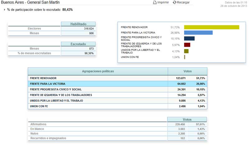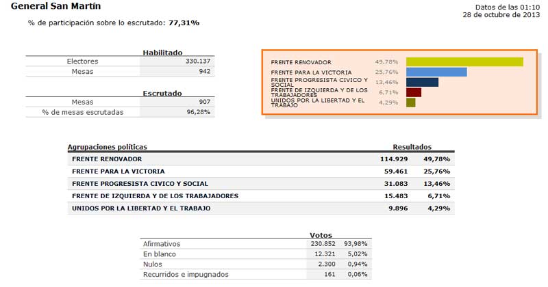 Para Diputado, Sergio Massa, alcanzó el 51,73% de los votos, casi duplicando losvotos de Insaurralde que logró el 26,98%