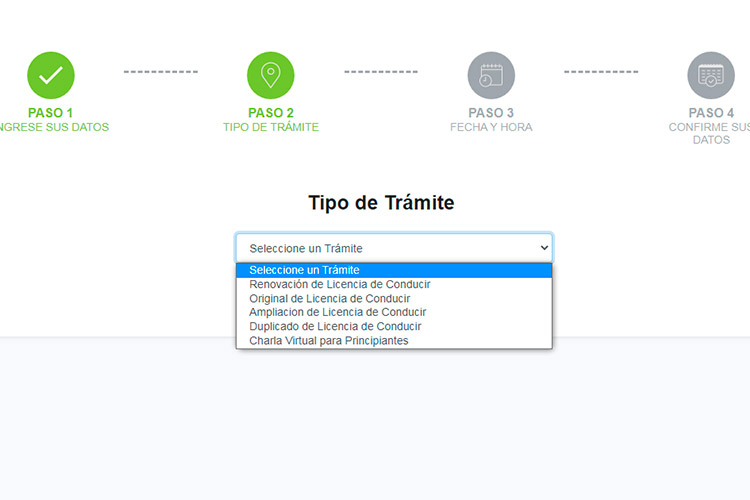 - Paso 4: Elejir tipo de Tramite a realizar.