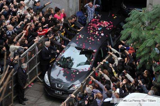La llegada ocurrió una hora más tarde de haber salido de la Legislatura en medio de un gentío abigarrado que disimuló el aguacero haciendo llover flores sobre el cortejo fúnebre.