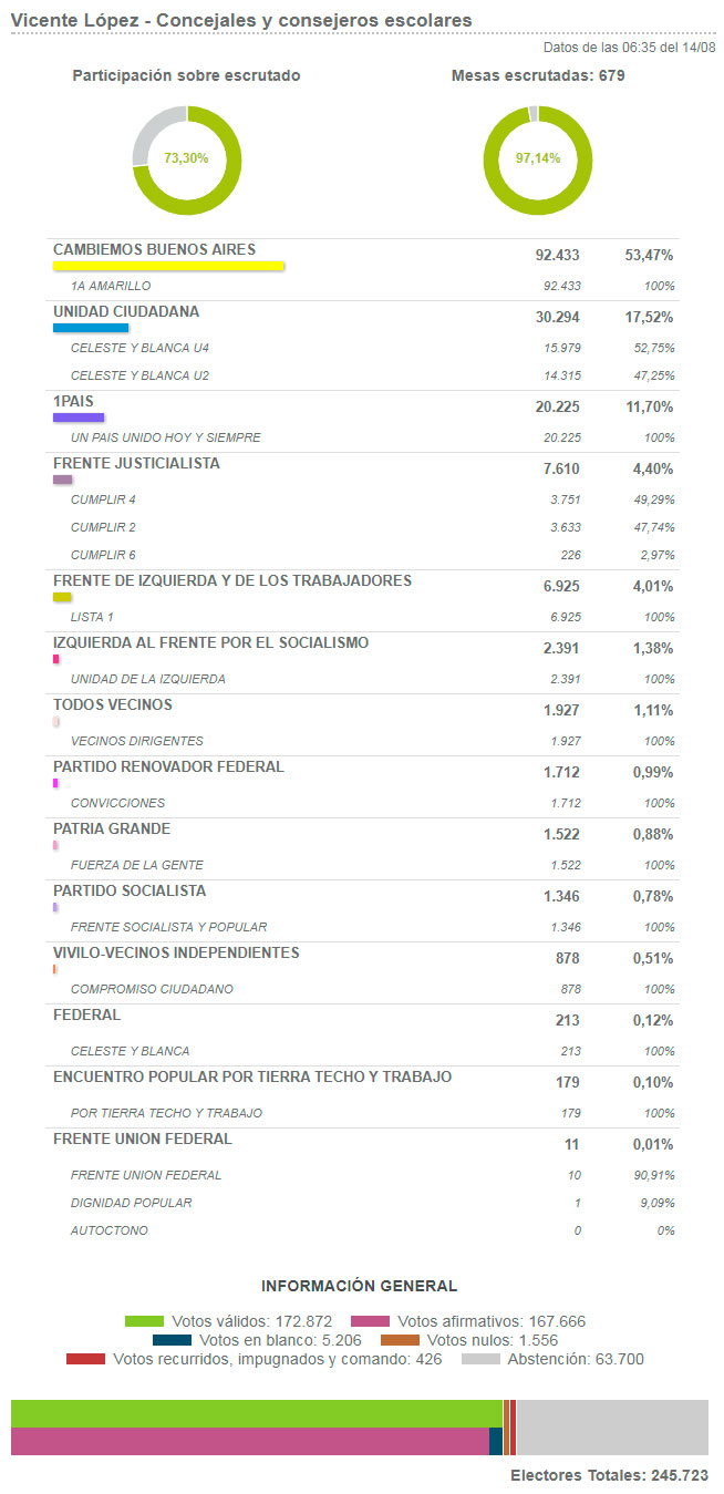 Con el 90% de las mesas escrutadas, la lista del intendente Jorge Macri, que lleva como primera candidata a soledad Martìnez obtiene un contundente triunfo sobre la lista de Unidad Ciudadana, donde se resuelve una interna. Mucho más lejos se ubican las listas de 1Pais y el Frente Justicialista. Siga la elección actualizando esta página.