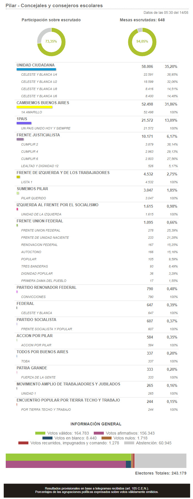 13.08.2017 - 23:59 Política Paso 2017: Resultados oficiales en Pilar Seguí los resultados oficiales de las elecciones de Octubre acá Datos oficiales PilarSiga minuto a minuto los resultados de la elección en Pilar, donde las listas de Unidad Ciudadana sacan una luz de ventaja sobre la lista oficialista de Cambiemos. Resultados Paso 2017