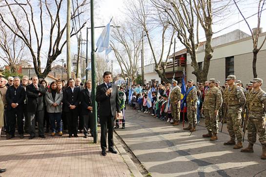Minutos antes se entonaron las estrofas de nuestro Himno Nacional con el acompañamiento de la Banda de la Escuela de Suboficiales del Ejército Argentino Sargento Cabral “Combate de San Lorenzo”. Durante el acto también colocaron ofrendas florales al pie del monumento en la plaza.