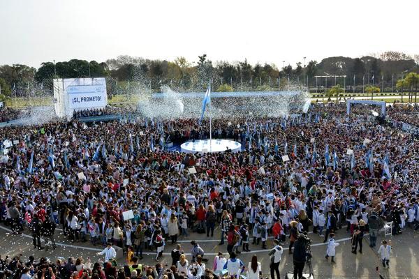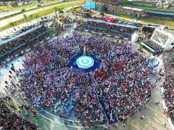Frente a los todas las instituciones y sus respectivos abanderados, el intendente Zamora encabezó la lectura de los votos que conforman la promesa. Luego de la respuesta afirmativa de los alumnos, miles de papelitos blancos y celestes tiñeron el playón, mientras los chicos agitaban sus banderas y bufandas argentinas.