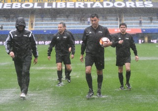 A las 15:30, el árbitro principal, el chileno Roberto Tobar, recorrió el campo de juego con sus colaboradores intentando hacer roda la pelota, que quedaba estancada en cada espejo de agua que se divisaba desde las alturas.