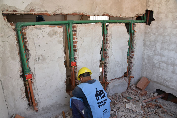 En ese sentido, en la Primaria N°8 se trabaja en la refacción de los sanitarios para niños, niñas y personas con discapacidad, se realiza la impermeabilización de la cubierta del comedor y se avanza con la pintura general en la fachada.