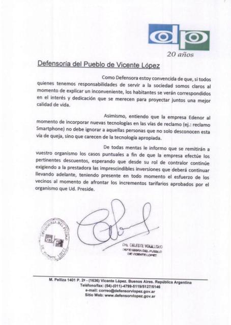 La Defensora del Pueblo Dra. María Celeste Vouilloud dirigió una nota al Ente Nacional Regulador de la Electricidad -ENRE- en relación a los sucesivos cortes del suministro eléctrico que se han producido en el transcurso del mes en diferentes barrios del Partido de Vicente López.