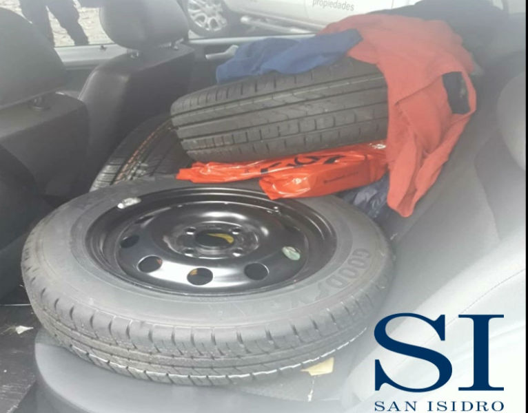 En presencia de testigos, se registró el interior del auto y se encontraron tres ruedas completas, herramientas utilizadas para la sustracción de neumáticos como llaves cruz, cricket y tuercas de seguridad, además de pertenencias varias posiblemente producto de algún ilícito reciente.