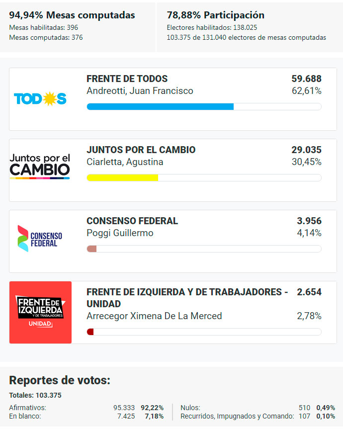 En cuanto a los resultados finales de las Elecciones Generales, con un 73,48% de las mesas escrutadas, Juan Andreotti cosechó el 66,80% de los votos. Por detrás quedaron para Agustina Ciarletta (Juntos por el Cambio) con el 26,19%; Guillermo Poggi (Consenso Federal) con el 4,24%; y Ximena Arrecegor (FIT) con el 2,78%.