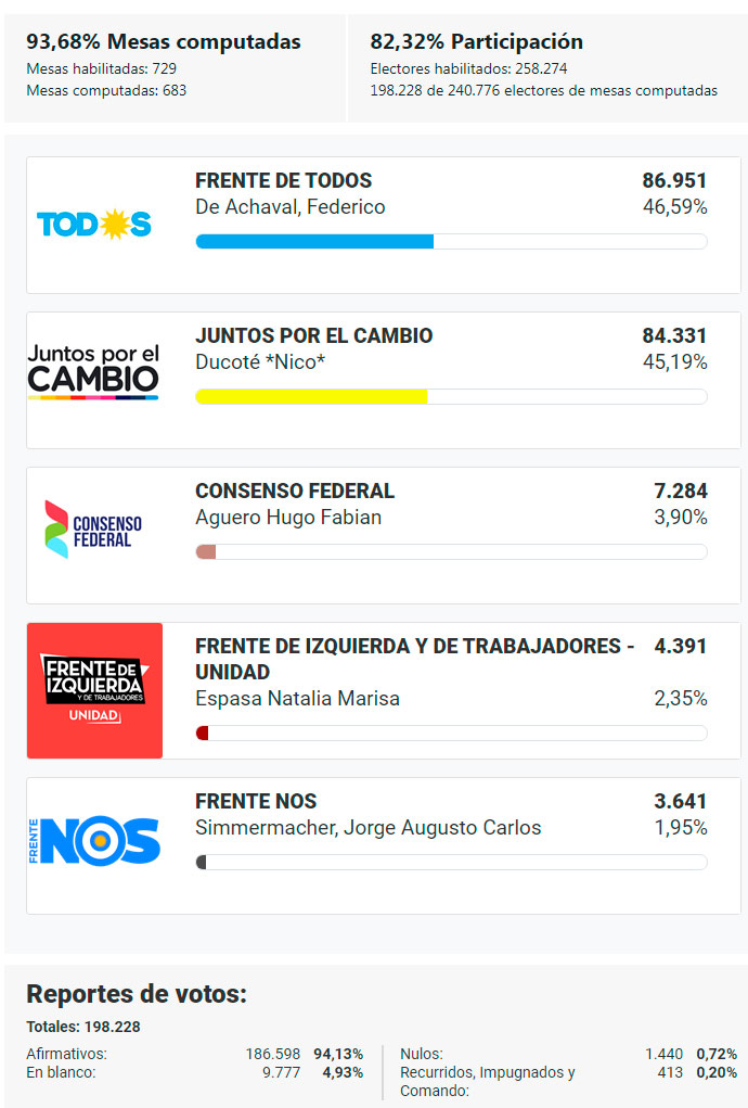 Más atrás Fabián Agüero de Consenso Federal alcanzó el 3,90% y el Frente de Izquierda con la candidatura de Natalia Marisa Espasa com el 2,35%.
