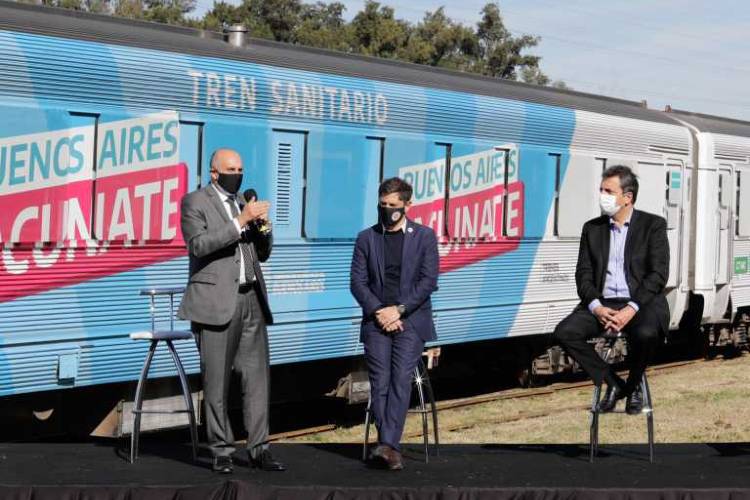 El gobernador de la provincia de Buenos Aires, Axel Kicillof, el ministro de Transporte, Alexis Guerrera, y el presidente de la Cámara de Diputados, Sergio Massa, coincidieron en destacar la importancia de la presencia del Estado al presentar hoy el tren sanitario que visitará diferentes localidades bonaerenses, permitiendo que sus habitantes se hisopen, vacunen y controlen.