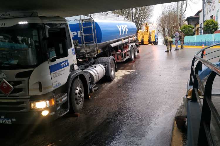 Pasadas las 17 horas de hoy el chofer de un camión cisterna de la empresa YPF intentó cruzar el Túnel del Bicentenario en la calle Chacabuco con dirección hacia la Avenida Cazón, y al parecer no calculó adecuadamente la altura y chocó contra el techo del bajo nivel quedando atascado.