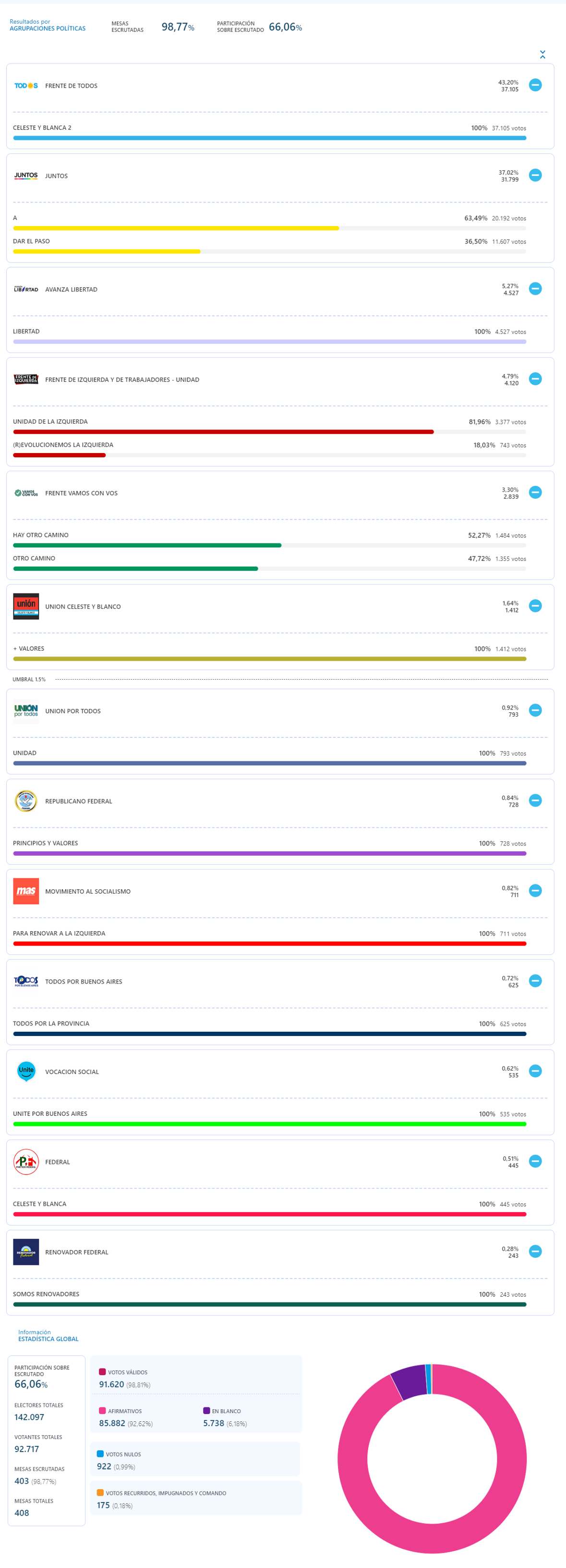Por último, Unión Celeste y Blanco 1.64%. El resto de las fuerzas no alcanzan el piso para competir en las elecciones del 14 de noviebre.