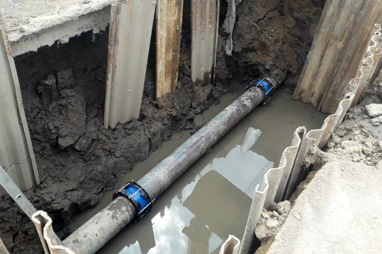 Debido a la complejidad del terreno, personal de AySA tuvo que intervenir con equipo especializado y armar una contención mediante tablestacado para proceder a la renovación del tramo de cañería dañado a más de 2 metros de profundidad.