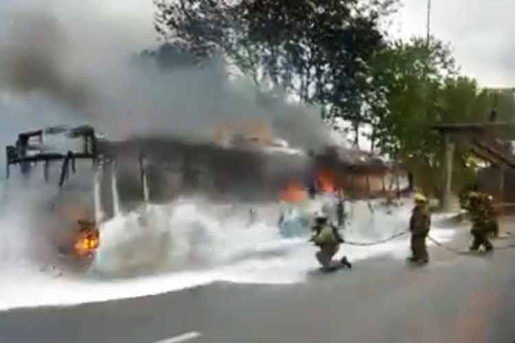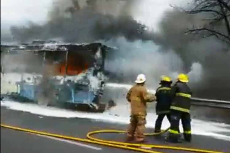 El siniestro ocurrió poco antes de las 16 en el kilómetro 47 de la autopista, a la altura de Larralde, cuando se originó el fuego por una presunta falla mecánica en el fuelle del colectivo articulado estacionado en la banquina.