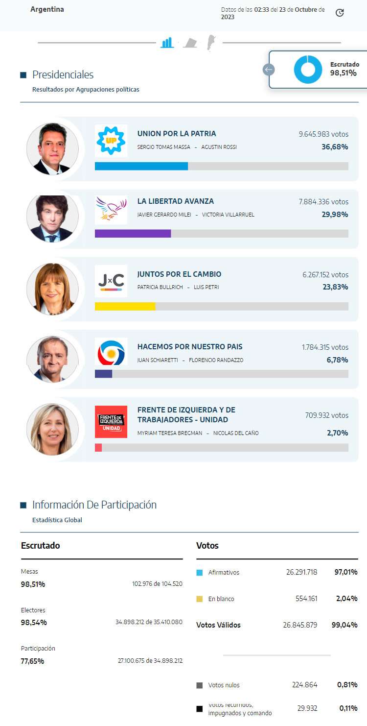 El candidato presidencial de Unión por la Patria (UxP) y ministro de Economía, Sergio Massa, se imponía esta noche en la provincia de Buenos Aires con el 43.51 % de los votos sobre los postulantes de la oposición, Javier Milei de La Libertad Avanza (LLA) con 25.59% y Patricia Bullrich, de Juntos por el Cambio (JxC) con 23.57%, con el 67 por ciento de las mesas escrutadas.