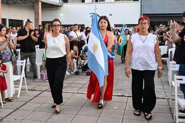 La jornada comenzó con el ingreso de las banderas de ceremonia nacional y provincial, seguido por la entonación del Himno Nacional. Posteriormente, Gisela Zamora dirigió unas palabras de aliento a los graduados, subrayando el respaldo del Municipio hacia la educación pública. También participaron la inspectora regional Amelia Bressan, quien ofreció un discurso, y una banda de música que cerró el evento con una actuación en vivo.