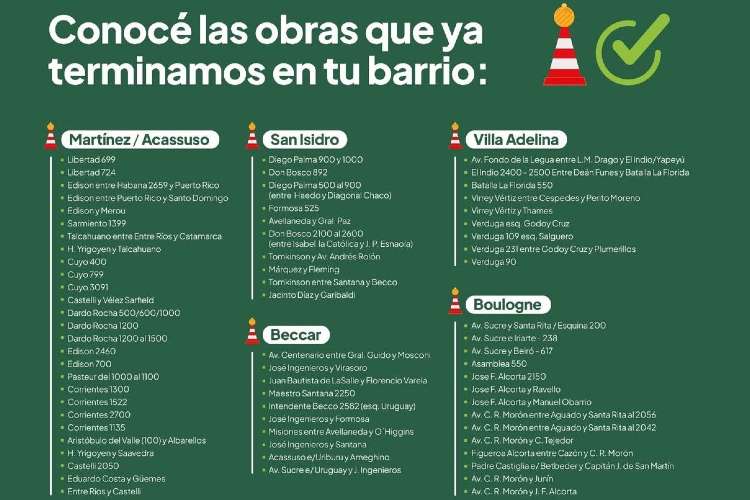 Av. Centenario entre Gral. Guido y Mosconi – Veredas; José ingenieros y Virasoro; Juan Bautista de LaSalle y Florencio Varela; Maestro Santana 2250; Intendente Becco 2582 (esq Uruguay); José Ingenieros y Formosa; Misiones entre Avellaneda y O´Higgins; José Ingenieros y Santana; Acassuso e/Uriburu y Ameghino; Av. Sucre e/ Uruguay y J.Ingenieros