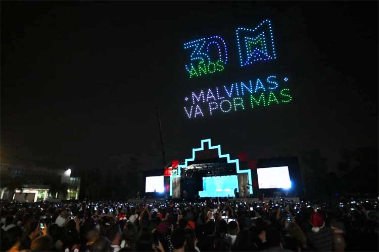 Uno de los momentos más destacados fue el show de drones, que proyectó figuras como la Sagrada Familia, el tren Belgrano Norte, Papá Noel y un “Malvinas 30 Años”.